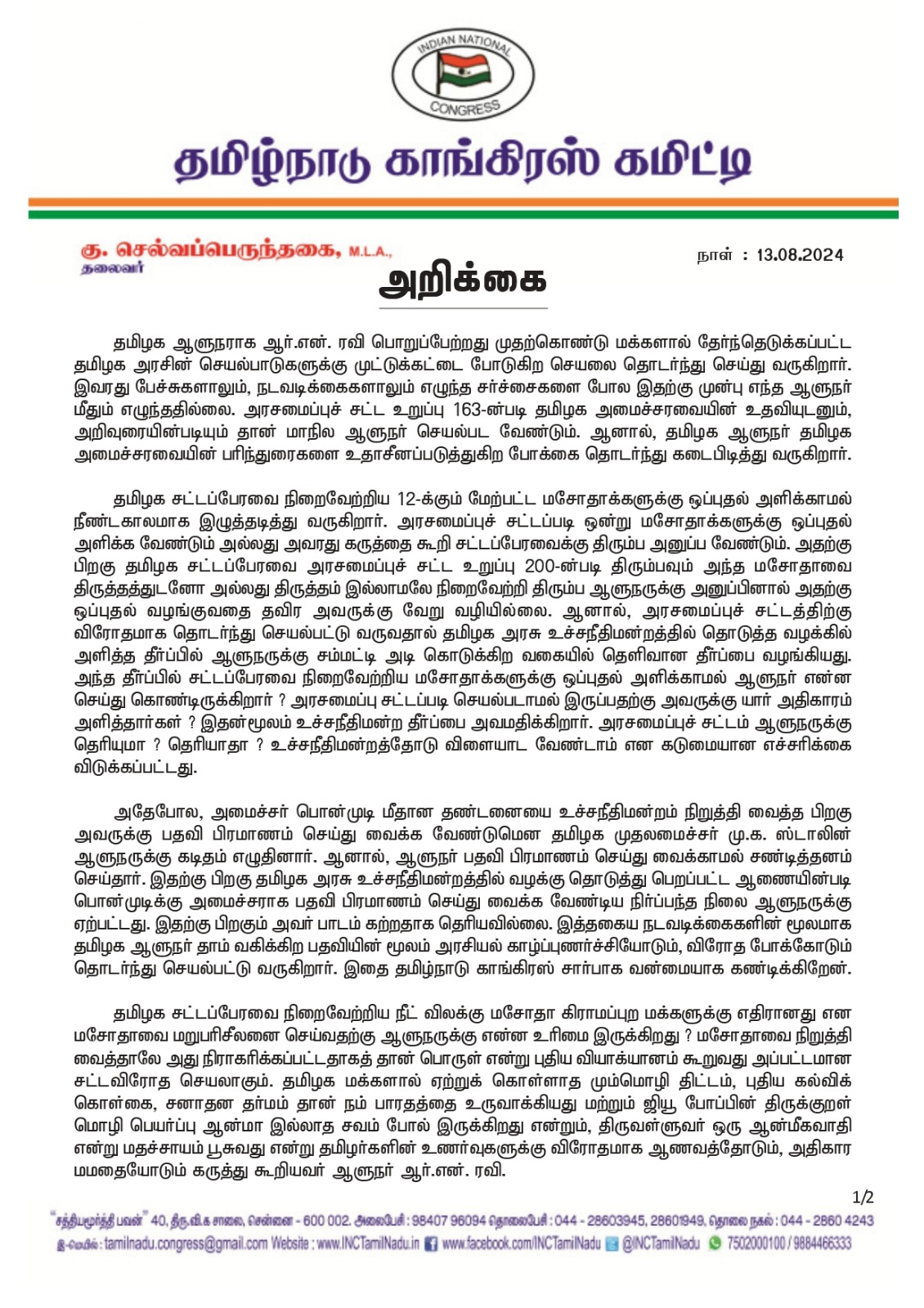 இதற்கு பிறகும் அவர் பாடம் கற்றதாக தெரியவில்லை. இத்தகைய நடவடிக்கைகளின் மூலமாக தமிழக ஆளுநர் தாம் வகிக்கிற பதவியின் மூலம் அரசியல் காழ்ப்புணர்ச்சியோடும், விரோத போக்கோடும் தொடர்ந்து செயல்பட்டு வருகிறார். இதை தமிழ்நாடு காங்கிரஸ் சார்பாக வன்மையாக கண்டிக்கிறேன்.