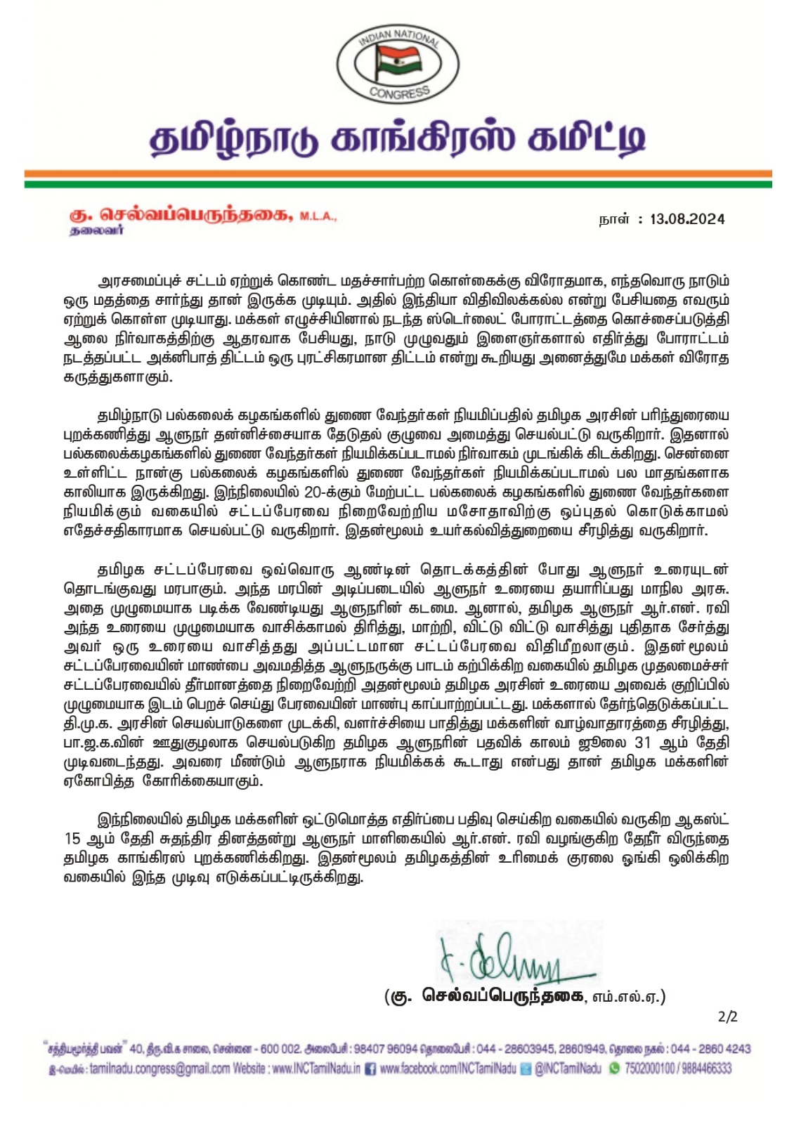 இது தொடர்பாக காங்கிரஸ் கமிட்டி தலைவர் செல்வப்பெருந்தகை வெளியிட்டுள்ள அறிக்கையில், சுதந்திர தினத்திற்கு ஆளுநர் தேநீர் விருந்துக்கு அழைத்திருப்பதாகவும் அவரது அழைப்பிற்கு நன்றி எனவும் குறிப்பிட்டுள்ளார்..