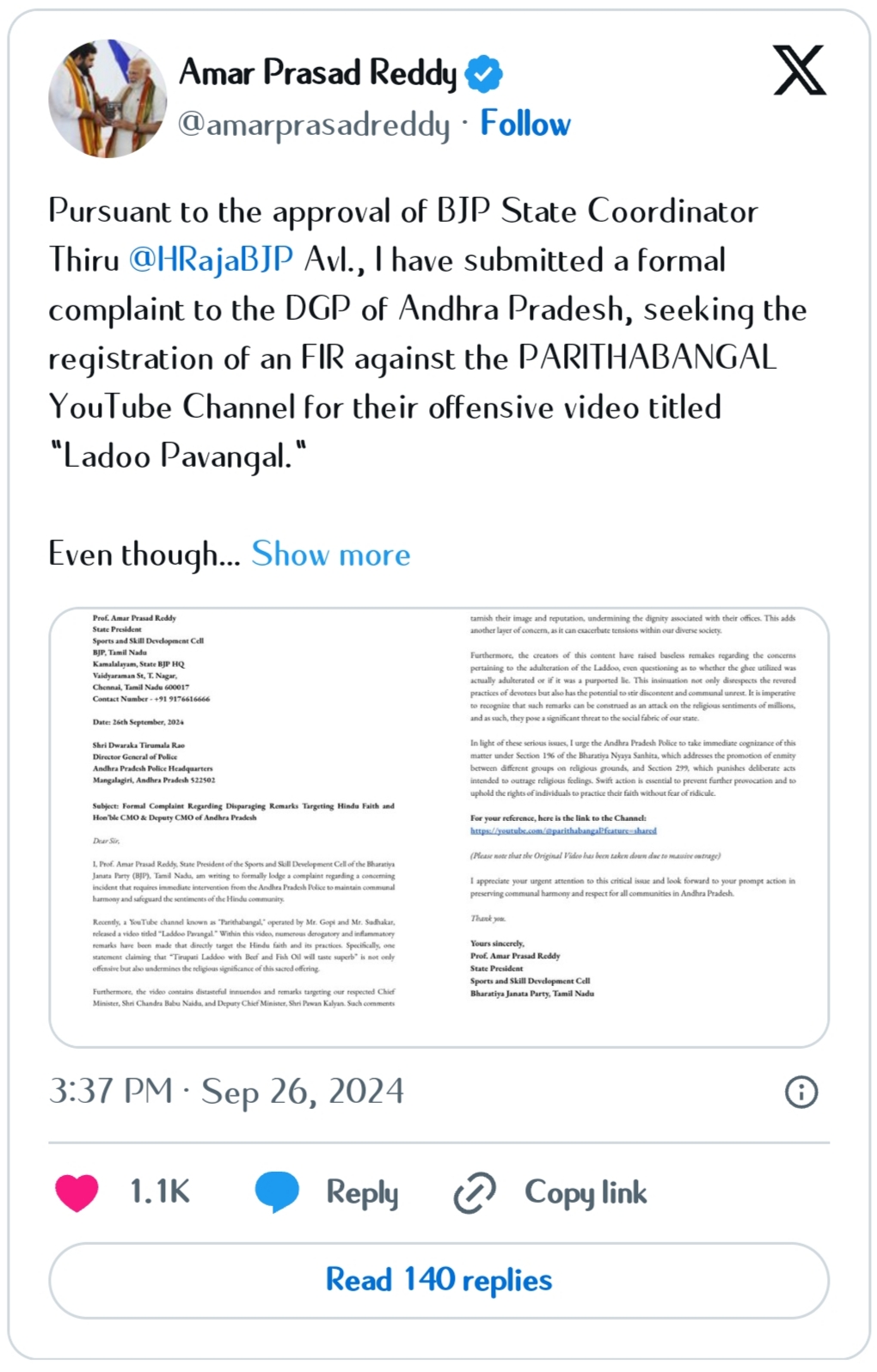 இதுகுறித்து  அவர் தனது எக்ஸ் வலைத்தளம்  பக்கத்தில்  பதிவிட்டிருப்பதாவது “லட்டு பாவங்கள்” என்ற தலைப்பிலான அவதூறு வீடியோவிற்கு, பரிதாபங்கள் யூடியூப் சேனலுக்கு எதிராக எஃப்ஐஆர் பதிவு செய்யக் கோரி, ஆந்திரப் பிரதேச டிஜிபியிடம் முறையான புகார் ஒன்றைச் சமர்ப்பித்துள்ளேன். அவர்கள் வீடியோவை நீக்கியிருந்தாலும், வீடியோ இந்துக்களின் உணர்வுகளை அவமதிப்பது மட்டுமல்லாமல், சமூகங்களுக்கு இடையே பகையை வளர்க்கவும், சட்டம் – ஒழுங்கு பிரச்சினைகளைத் தூண்டும் விதமாகவும் உள்ளது” எனக் குறிப்பிட்டுள்ளார்.