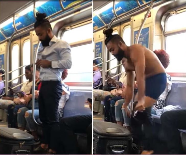 ஃபேஸ்புக்கில் @princezee என்ற பயனர் நியூயார்க் நகர மெட்ரோவிற்குள் இளைஞர் ஒருவர் தனது ஆடைகளை நீக்குகிறார். அதன் பின்னர் தான் கொண்டு வந்த சூட்கேஸில் தண்ணீரை நிரப்பி அதற்குள் ஏறி நின்று குளிக்க ஆரம்பிக்கிறார். இந்த வீடியோ இதுவரை 1.4 மில்லியனுக்கும் அதிகமான பார்வையாளர்களைக் கடந்துள்ளது.