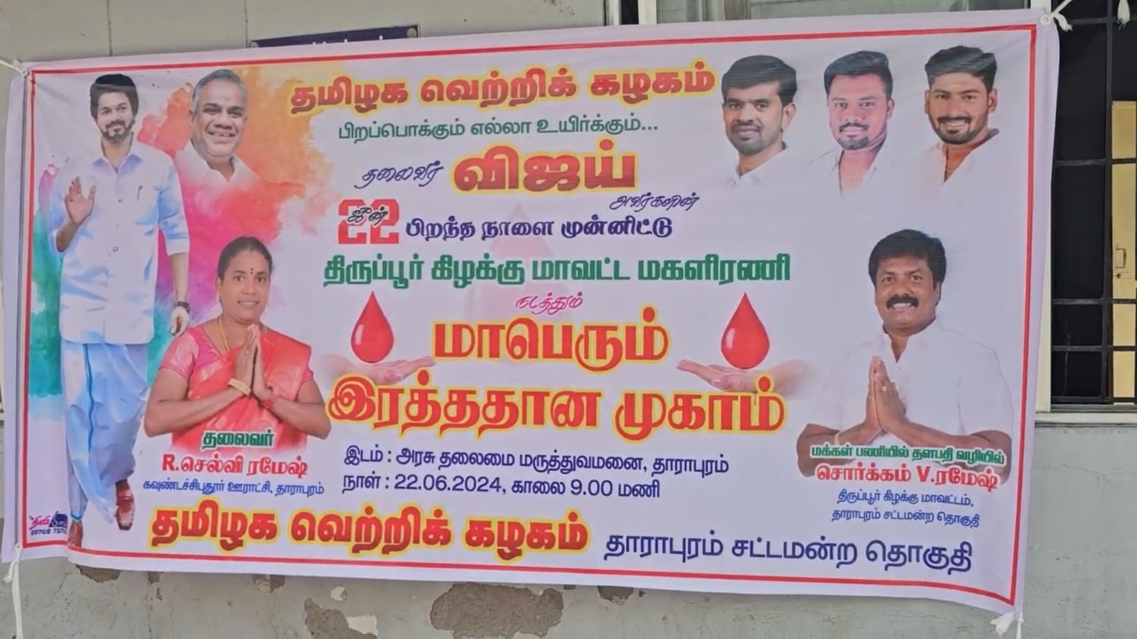 திருப்பூர் மாவட்டம் தாராபுரத்தில் தமிழக வெற்றி கழகத்தின் நிறுவன தலைவர் நடிகர் விஜயன் 50 ஆவது பிறந்த நாளை முன்னிட்டு அக்கட்சியின் தாராபுரம் தொகுதி பொறுப்பாளர் கவுண்டச்சி புதூர் தலைவர் செல்வி ரமேஷ் தலைமையில் 50 பேர் ரத்தம் தானம் வழங்கினர்.