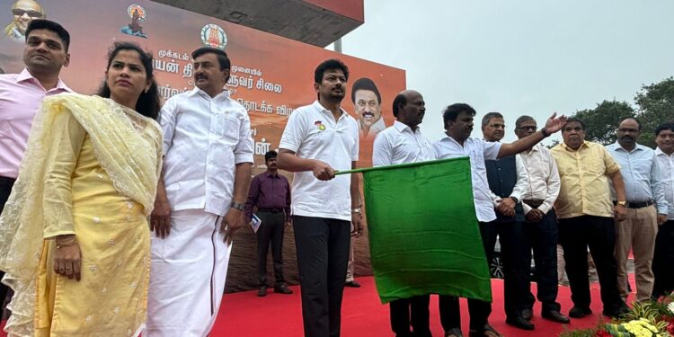 கன்னியாகுமரியில் டிசம்பர் 30 மற்றும் 31 ஆகிய நாட்களில் நடைபெறவுள்ள அய்யன் திருவள்ளுவர் சிலை திறப்பு வெள்ளி விழாவை முன்னிட்டு சென்னை, அண்ணா சாலை, பல்லவன் இல்லம், மாநகர் போக்குவரத்துக் கழக மத்திய பணிமனையில், பொதுமக்களிடம் விழிப்புணர்வு ஏற்படுத்தும் வகையில் அய்யன் திருவள்ளுவர் சிலை வெள்ளி விழா இலச்சினை மற்றும் சிலை குறித்த விவரங்கள் அடங்கிய தமிழ்நாடு அரசுப் போக்குவரத்துக் கழக விரைவு பேருந்துகளை துணை முதலமைச்சர் உதயநிதி ஸ்டாலின் கொடியசைத்து தொடங்கி வைத்தார்.
