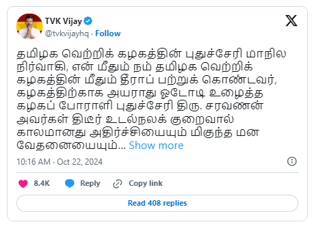 இதுகுறித்து அவர் தனது எக்ஸ் வலைத்தளம் பக்கத்தில் பதிவிட்டிருப்பதாவது “தமிழக வெற்றிக் கழகத்தின் புதுச்சேரி மாநில நிர்வாகி, என் மீதும் நம் தமிழக வெற்றிக் கழகத்தின் மீதும் தீராப் பற்றுக் கொண்டவர், கழகத்திற்காக அயராது ஓடோடி உழைத்த கழகப் போராளி புதுச்சேரி திரு. சரவணன் அவர்கள் திடீர் உடல்நலக் குறைவால் காலமானது அதிர்ச்சியையும் மிகுந்த மன வேதனையையும் அளிக்கிறது.